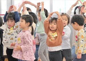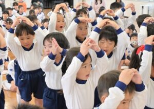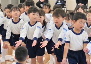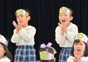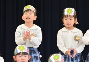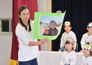お遊戯室に集まった子どもたちは、先生の季節の話を興味津々で聞いていました。
