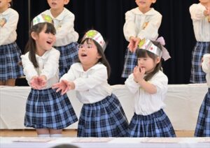 毎月先生からの手作りプレゼント(出し物)も楽しみのひとつ❤ 楽しみにしながら待っていると…“すみれキッチンオーケストラ”の3人組が登場!!子どもたちは大盛り上がり!早速、一緒に振り付けを覚えて、ミュージックスタート🎵「キッチンオーケストラ」の曲に合わせて、身近にあるキッチングッズを使った“すみれキッチンオーケストラ”の演奏と、子どもたちのノリノリの振り付けで、お遊戯室に集まったみんなの心が一つになりました。