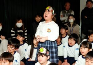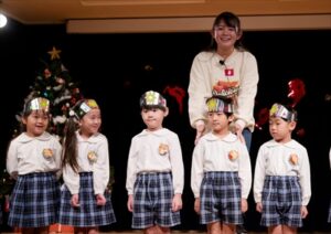 遊戯室の舞台の上には、年長組が飾り付けをした大きなクリスマスツリー遊戯室一面の飾りがキラキラと輝き、入場した子どもたちは「わあぁ~。きれい✨」と声をあげていました。お誕生日会がスタートすると、しっかり司会の先生の方を向いて、季節の話を聞き、お誕生日のお友達をお祝いしました。
