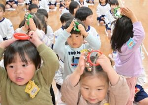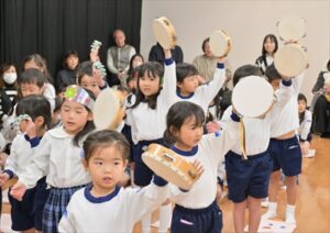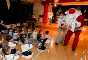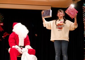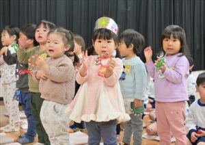 お誕生日会の後には、クリスマス会がスタート!!先生が話をしていると…どこからか鈴の音が!しばらくすると、サンタクロースさんが登場🎅!!会場は大盛り上がり!合奏を聴いてもらったり、子どもらしい可愛い質問にも答えてもらったりと、サンタさんに会えてとても嬉しそうな子どもたちでした。サンタさんからのプレゼントにも、大喜び🎵大きな声で「ありがとう!」も伝えることができました。あっという間の時間でしたが、サンタさんと一緒に過ごせたことは子どもたちにとって、とてもいい思い出になったことでしょう。