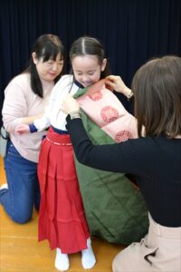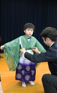 年長組は、特別に装束衣装の体験!!黒田様に衣紋(着付けてもらうこと)してもらうと、とっても嬉しそう💗凛々しく、可愛らしく、普段とは違う姿を見せてくれました。