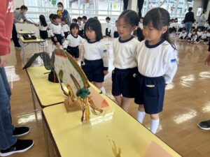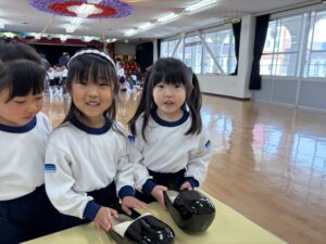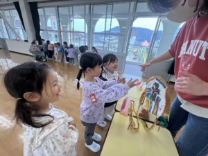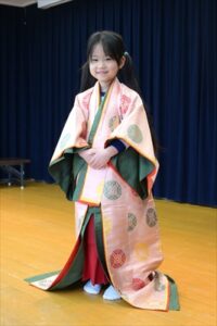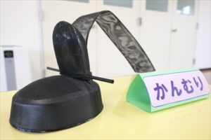 最初に、黒田様に京都の伝統文化や装束など、とてもわかりやすくお話いただき、みんな興味津々❕時折クイズも交えて楽しく学びました✨そして、実物の「冠(かんむり)」、「笏(しゃく)」、「檜扇(ひおうぎ)」、「釵子(さいし)」、「浅沓(あさぐつ)」の鑑賞をし、「笏」と「浅沓」は実際に触らせてもらいました😍遊戯室に飾られた五段雛飾りと見比べて、「お雛様とお内裏様が持ってはるのと一緒~!!」と、より身近に感じることができました。