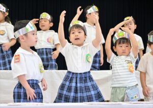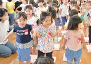 9月18日(木)9月のお誕生日会を行いました。年長~年少組・プチとまとクラブ(2歳児・満3歳児クラス)の全園児が遊戯室に集まりました。