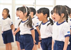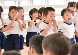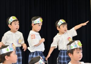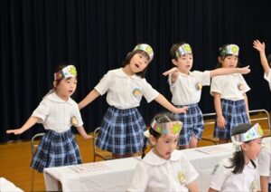 司会の先生から季節の話を聞き、舞台に並んだ誕生児に各学年から歌のプレゼントをしてお友達と一緒に楽しい雰囲気の中、お祝いすることができました♪季節の話やプレゼントの歌が秋を感じさせてくれました。